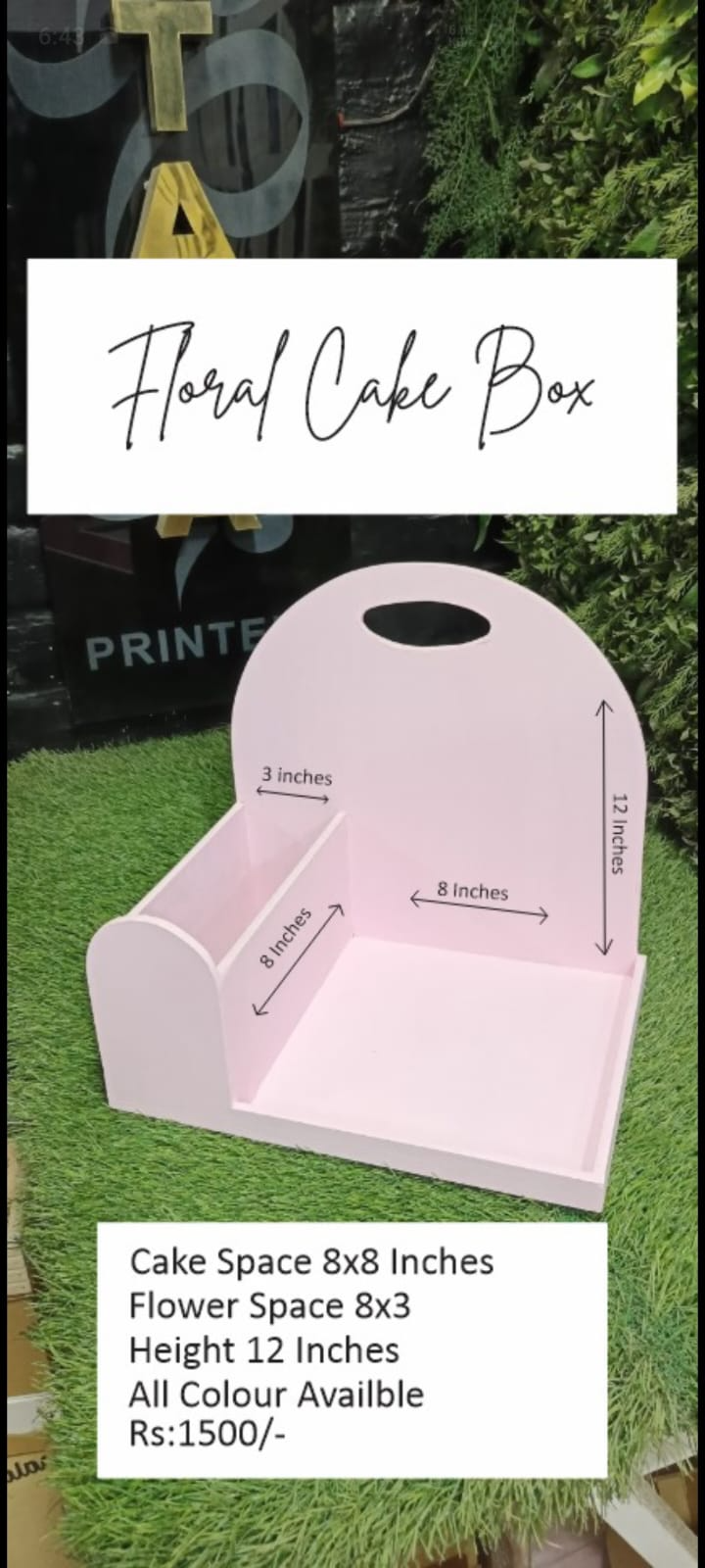 * 8×8 Cake Size area * 8×3 Flower area * 12 inch Height * 12 inch Width * 12 inch Length